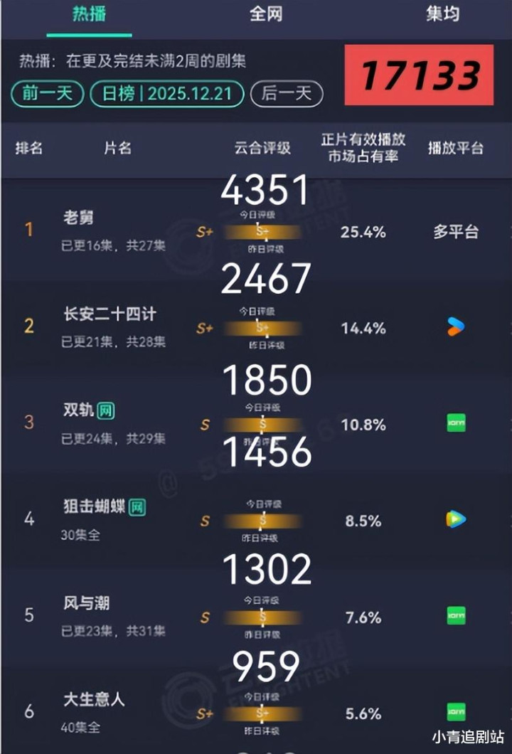 告成把屈居第二位的《长安二十四计》甩出去老远,成毅带着一堆老戏骨,刘奕君,王劲松,张涵予等东说念主,王人挡不住。